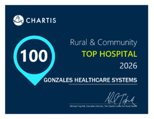 February 2026 – Gonzales Healthcare Systems today announced it has been recognized as a 2026 Top 100 Rural & Community Hospital by The Chartis Center for Rural Health. The Top 100 awards program celebrates outstanding performance annually among the nation’s rural hospitals based on the results of the Chartis Rural Hospital Performance INDEX®.